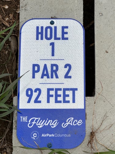 Small pitch and putt course that plays between a neighborhood and soybean field with planes flying overhead. It is great for practicing upshots and ace runs! Course is well maintained with fairways mowed and underbrush cut low. Tee areas were concrete and had slots for drainage. There were signs on each tee pad with distance. Baskets were in pristine condition with numbers mounted to the top and arrows in the basket directing you to the next tee pad making the course very easy to navigate. There was a good amount of shot variety allowing for both backhand and forehand dominant players to have a good time. There was a good mix of open and technical shots. There was an added bonus of a hanging basket on hole 6.